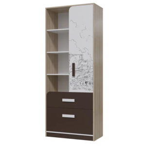 Набор мебели Арабика прекрасно вписывается в любой интерьер. Все модули выполнены в едином стиле. За счет контрастных фасадов и массивных ручек, гарнитур не заполняет собой всё пространство и выглядит гармонично. Шкаф-стеллаж станет прекрасным дополнением общего интерьера уютной детской комнаты. В двух выдвижных ящиках и на полках, скрытых за распашной дверцей, находится достаточно места для аккуратного хранения детских игрушек, одежды, а также школьных и канцелярских принадлежностей.